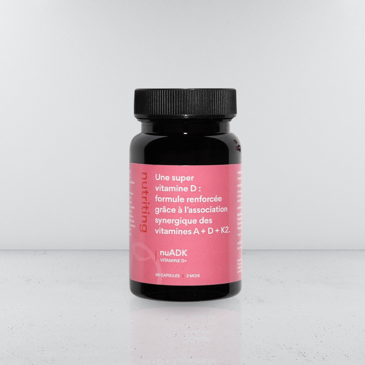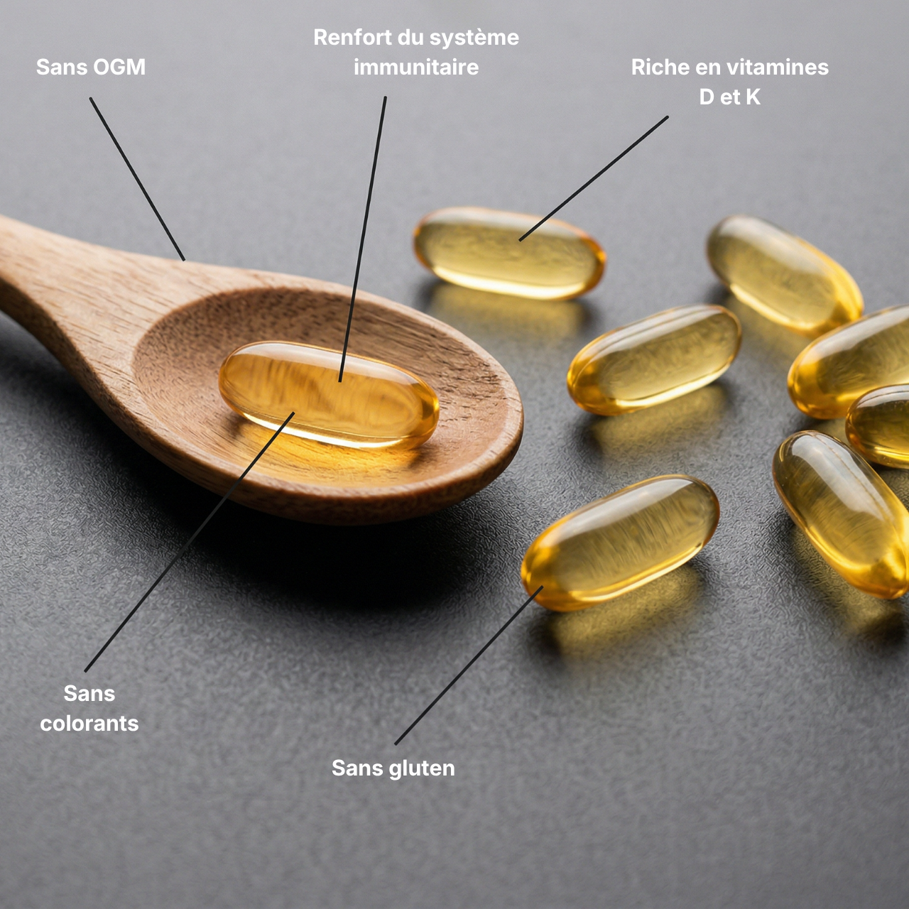 Enveloppe : gélatine (marine), glycérol (épaississant), eau (support), huile d’olive bio, vitamine K2 (ménaquinone-7), vitamine D3 (cholécalciférol), vitamine A acétate. Contient un produit à base de poisson.
