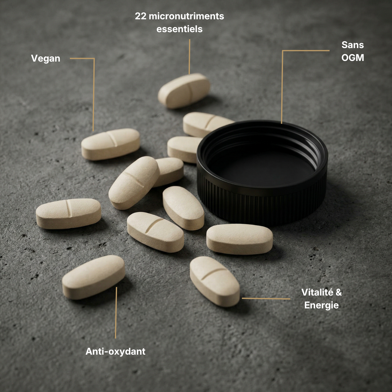 Citrate de magnésium, anti-agglomérants : fibre d’acacia et carbonate de magnésium, mélange de tocophérols d’origine naturelle (vitamine E), N-Acétyl Cystéine, acide ascorbique (vitamine C), acide alpha-lipoïque (100% R), citrate de zinc, extrait de thé vert bio, quercétine, huile d’olive bio, coenzyme Q10, ß-carotène, levure séléniée, calcium L-methylfolate (vitamine B9), nicotinamide (vitamine B3), extrait de Tagetes erecta (lutéine), biotine (vitamine B8), vitamine D3, pantothénate de calcium (vitamine B5), pyridoxal-5-phosphate (vitamine B6), chlorhydrate de thiamine (vitamine B1), riboflavine (vitamine B2), methylcobalamine (vitamine B12), iodure de potassium.